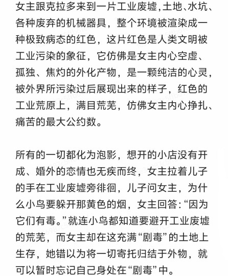 影片中的女主犯了两个错误:1.试图融入丈夫的环境;2.想从他人身上寻找感情寄托,丈夫不行,就找情人,但本质上依旧是将自己放在情感的下位,外界寄托所带来的幸福,永远只是暂时的。 女主朱莉·安娜,她神经质、焦虑、缺乏安全感,从她丈夫与外人的交谈中得知,女主曾经遇过车祸,虽身体无大碍,但脑部受到了震荡,丈夫轻描淡写的口气好像事不关己,充斥着冷漠与自私。女主的存在与周围的世界格格不入。蓝色,冰冷、抑郁、疏离;白色,虚无、困惑、寂寞,房间中色彩的渲染大量采用蓝色与白色的交织,放大了不安和孤独,她与丈夫乌戈的感情,同工业区的废墟一样,呈现一种破败的状态。 乌戈的伙伴工程师克拉多,是那个曾给女主短暂带来希望的人,然而这份希望并未能持续多久,像飘到天空的泡沫,被风轻轻一吹就破。乌戈与克拉多谈话时背后出现的黄色,象征着欺骗和出轨,代表了女主对感情的不贞。在后面,儿子欺骗女主,说自己生病这段剧情里,也大量出现黄色,用以象征欺骗。 女主也想过融入乌戈的圈子,可男人们的世界只有烟、酒、xing、生意,跟随男人们在一起的女人,仿佛没有自己的主见、没有自己的世界,只是沟通一些流于表面的议论,这群女人仿佛都已经成了男人手中的“提线木偶”,依附于牵着线的手。
